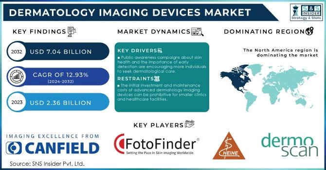 The Dermatology Imaging Devices Market size was valued at USD 2.36 billion in 2023 and is expected to reach USD 7.04 Billion by 2032, growing at a CAGR of 12.93% from 2024-2032.
